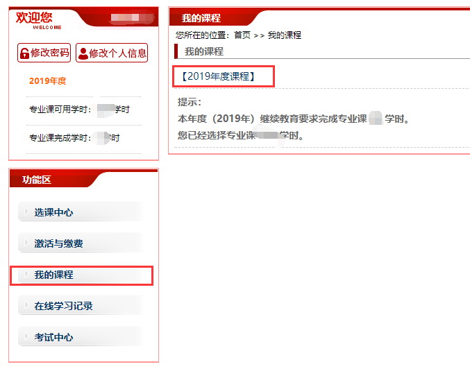 选课后您可以进行在线学习,点击功能区“我的课程”,选择培训年度,进入课程列表。